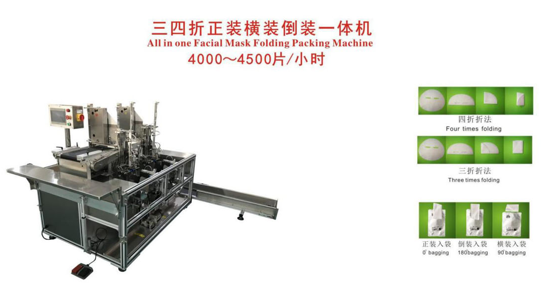 1、高速面膜折膜機的工作流程:手工放棉、自動折棉、自動轉向、自動裝袋、空袋檢測、自動壓袋、成品收集;